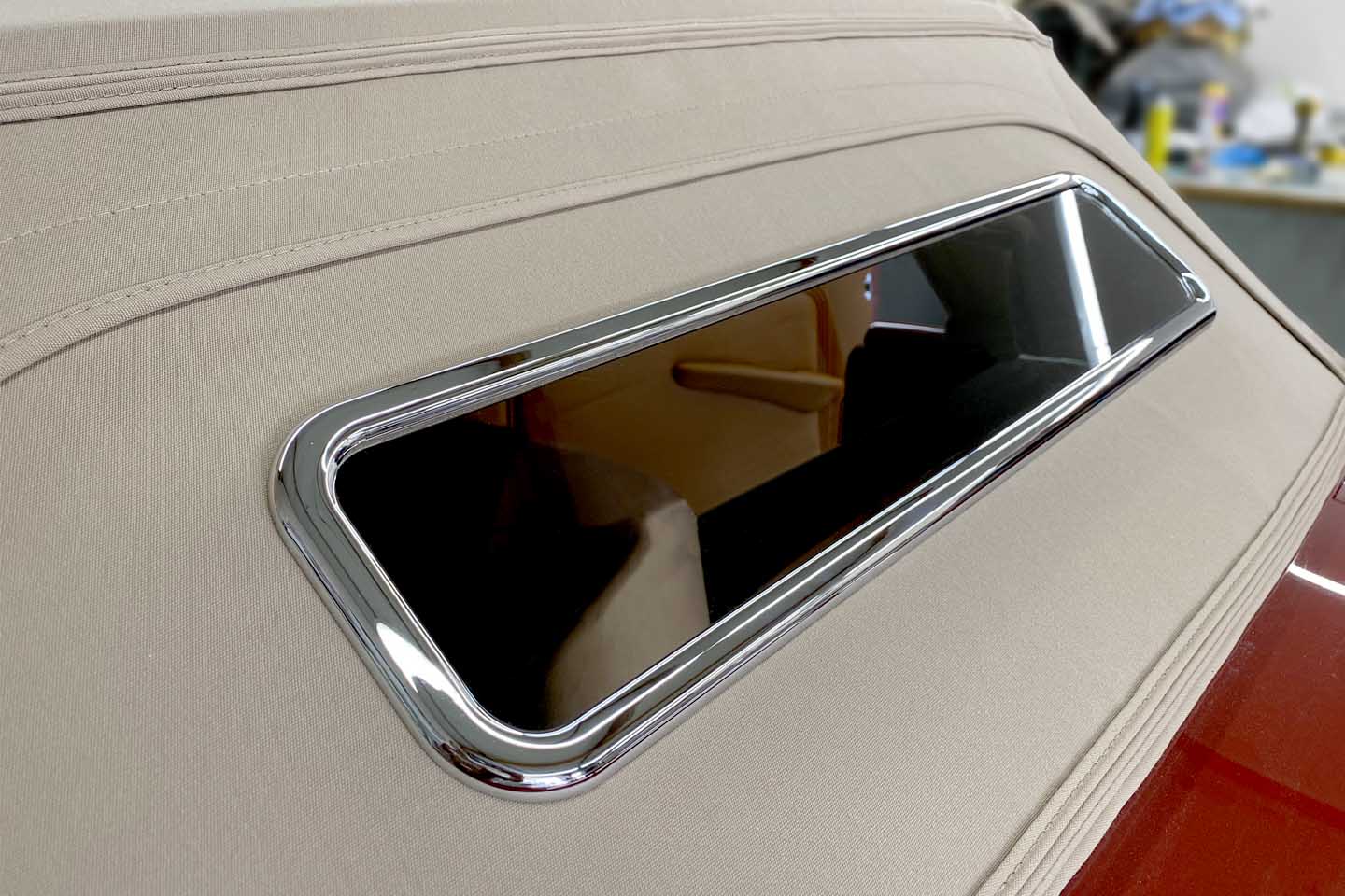 Beyond covering the convertible top Sid Chavers Company upholstered the interior and trunk. Beginning with a base of Dynamat sound and heat damping mat laid in the trunk and interior floor, padding was added to provide additional soundproofing and create a level surface to lay tan German square weave carpeting. The door and trunk panels as well as the seat were scratch built and then upholstered in caramel leather.