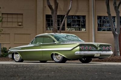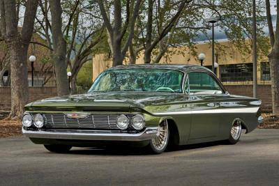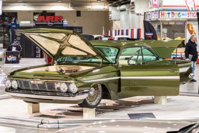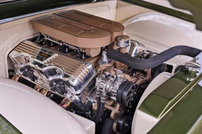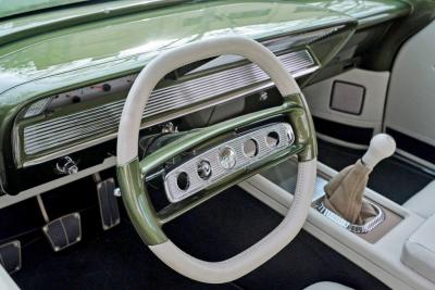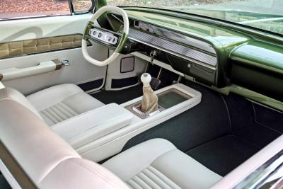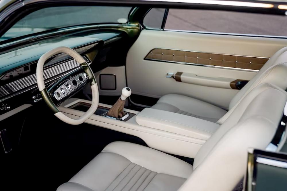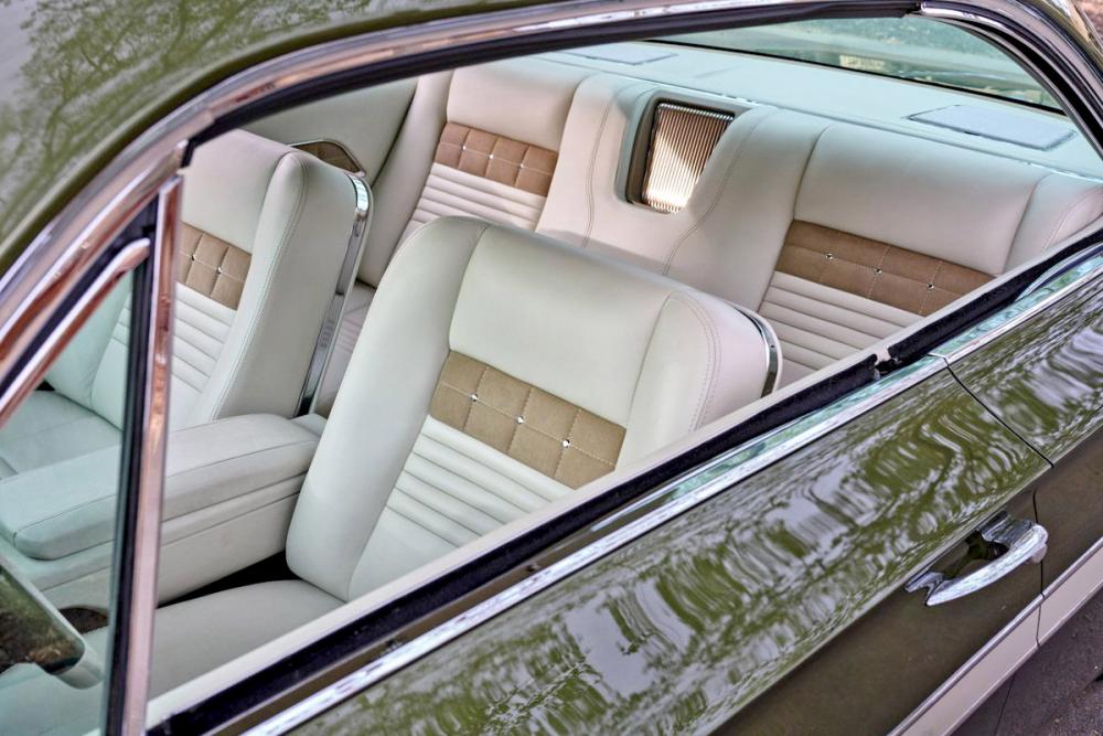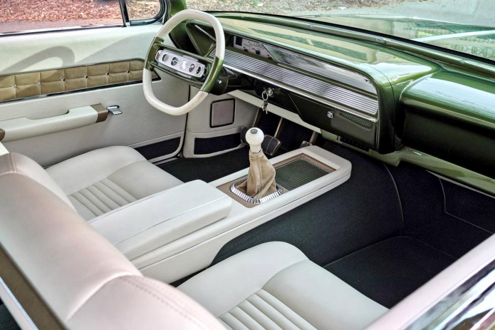 This interior theme honors the Impala heritage while giving it a custom twist. Tracy Weaver and his team at Recovery Room Interiors stitched off-white leather over custom seats and side panels in a clean ’60s style, complete with tan suede inserts and Impala-style trim buttons. There’s plenty of one-off custom-machined trim by Atomic Machine and Fiber Forged augmenting the upholstery work, including a custom aluminum bezel for the Dakota Digital instruments. The Recovery Room team upholstered the trunk to match, and even incorporated hidden compartments for a cigar humidor and martini shaker. Finishing touches inside include pedals and a shifter from Clayton Machine, and a custom-machined steering wheel atop the Flaming River tilt column.